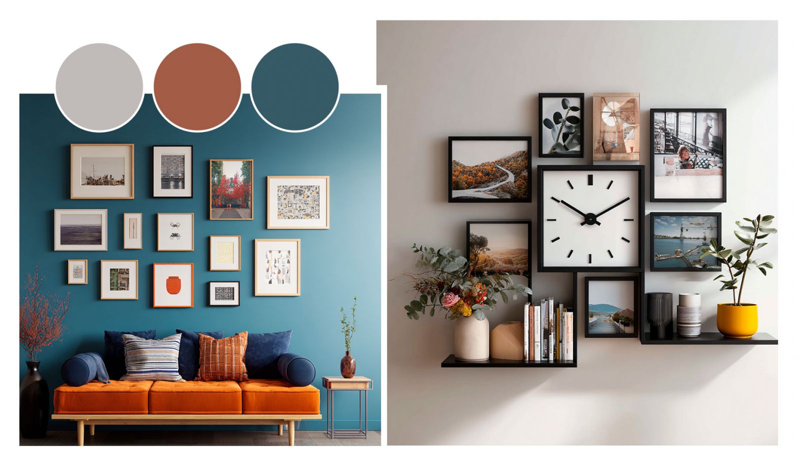 Она может строиться по принципу гармонии, когда все элементы объединены схожими оттенками и создают сбалансированное впечатление. Либо можно использовать контрастные цвета, чтобы добавить выразительности. Например, сочетание черно-белых фотографий и ярких акцентных рам сделает композицию живой и запоминающейся