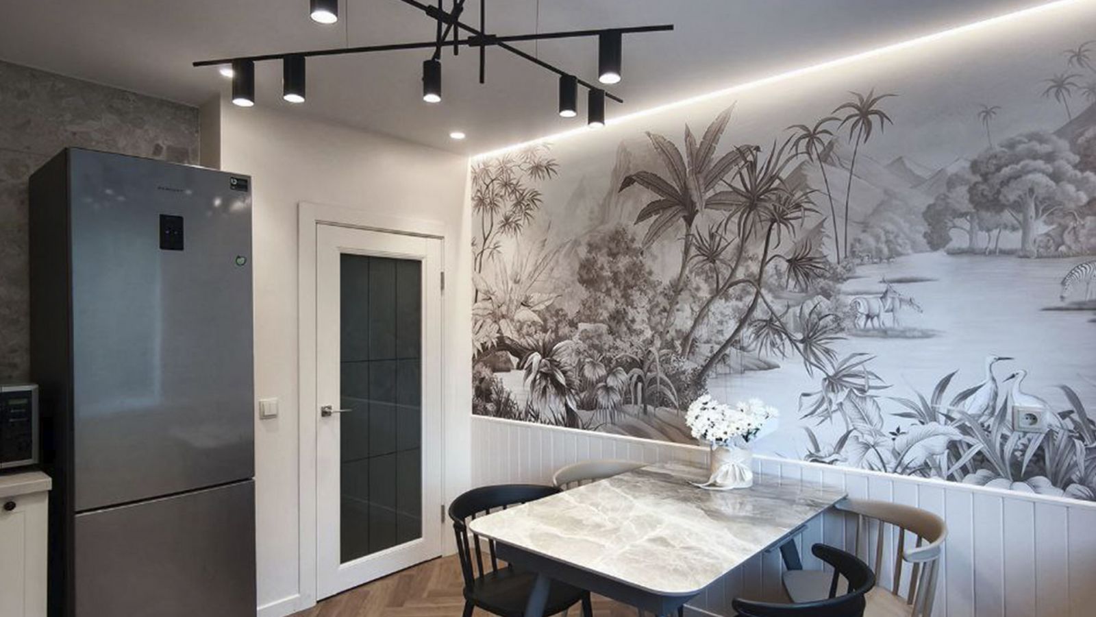 Как сделать обеденную зону по-настоящему уютной и стильной? Ответ прост: с помощью сюжета с тропическим узором (Арт. 33665) из нашей дизайнерской коллекции «It`s Jungle»! В этом интерьере такой оригинальный рисунок наполнил пространство завораживающим ритмом,  идеальным для семейных ужинов и встреч с друзьями!
